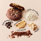 Our Chocolate Peanut Butter Cookie is a rich chocolate cookie, filled with smooth, gooey peanut butter and topped with roasted peanuts and mini chocolate chips.