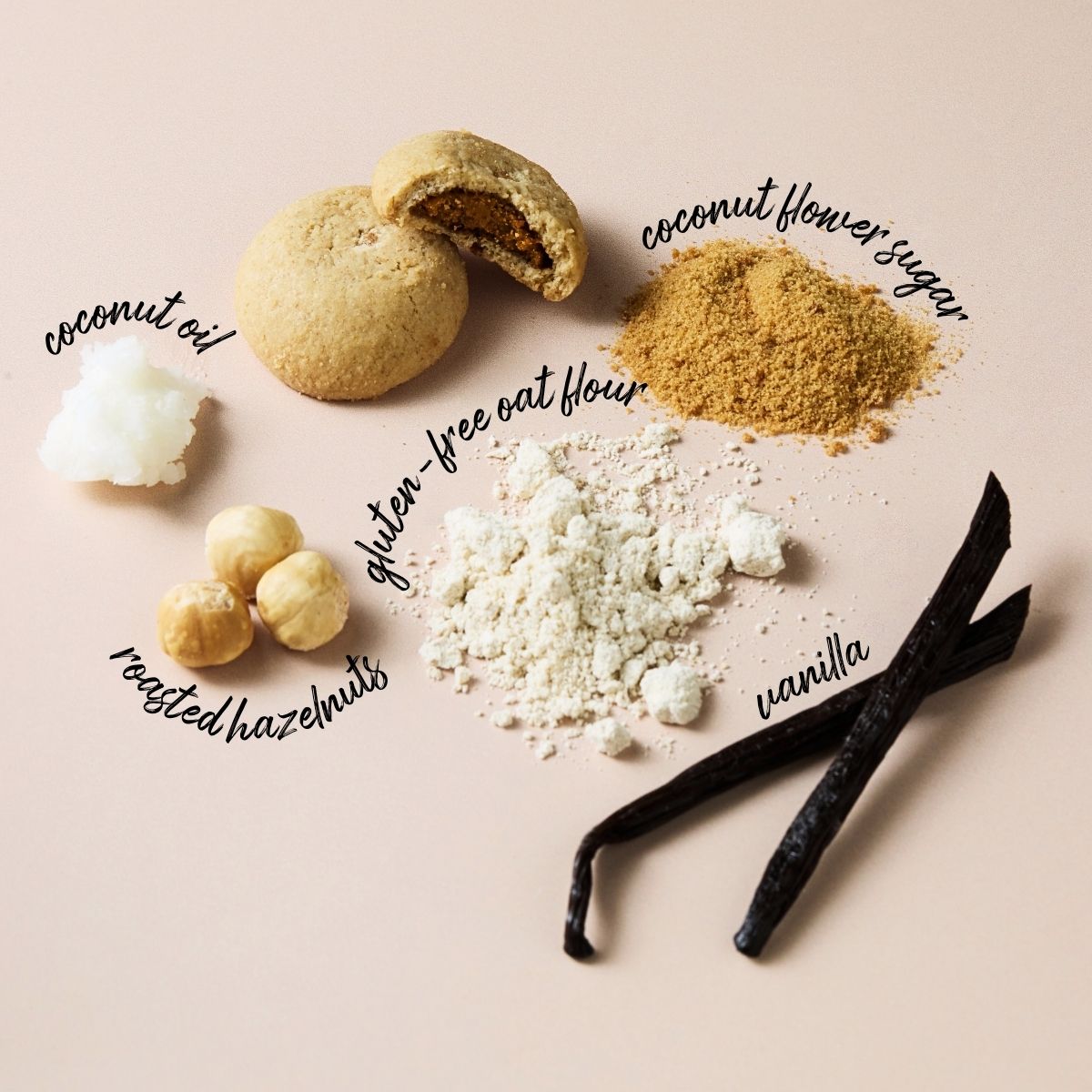 Cane sugar*(32%), gluten-free oat flour*, coconut oil*, sunflower oil*, hazelnuts*, cocoa butter*, coconut flower sugar*, cocoa mass*(1.5%), raising agent (cream of tartar, sodium bicarbonate), potato starch*, salt (0.2%), emulsifier (sunflower lecithin*), vanilla extract*. ALLERGENS: Please see the ingredients in bold. May contain traces of other nuts and peanuts.